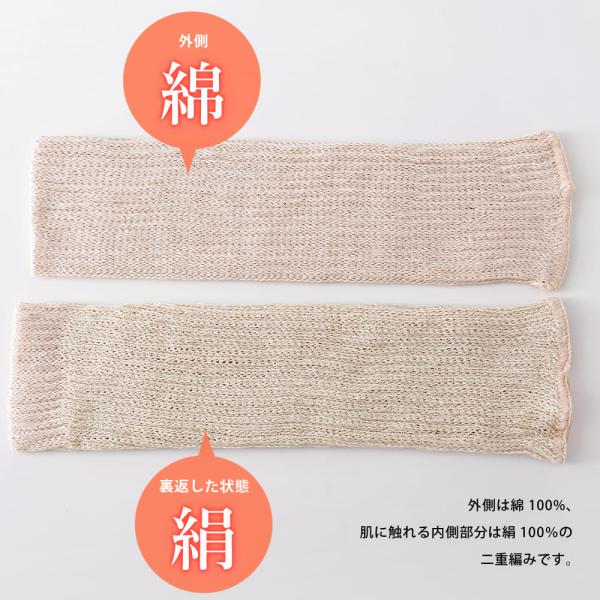 外側は「綿100%」、肌に触れる内側部分は「絹100%」の二重編み。