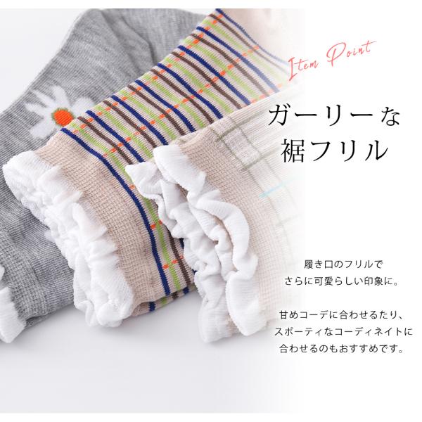 花柄やチェック、ドット柄などのフェミニンな柄に加えて、履き口のフリルでさらに可愛らしい印象に。