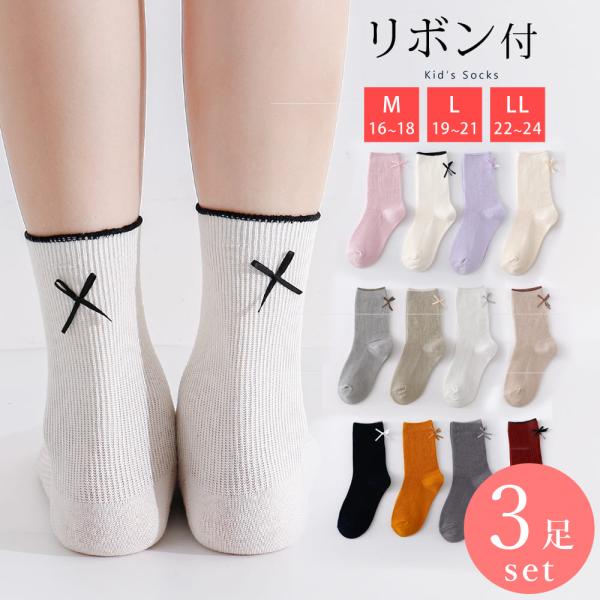 靴下 キッズ ソックス 3足 セット 子供 リブ リボン付 表糸綿100% コットン 女の子 16cm〜24cm 16 17 18 19 20 21 22 23 24 ジュニア 通年 送料無料