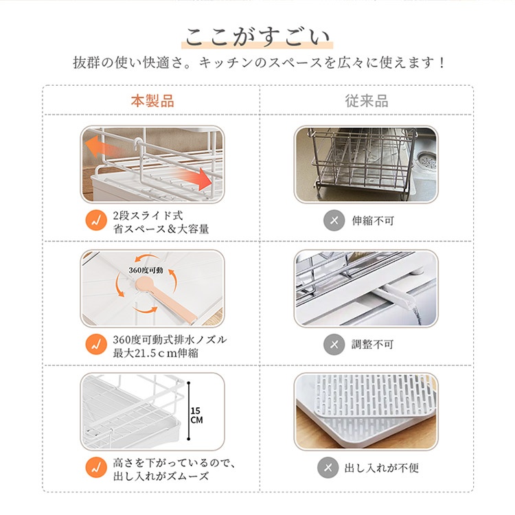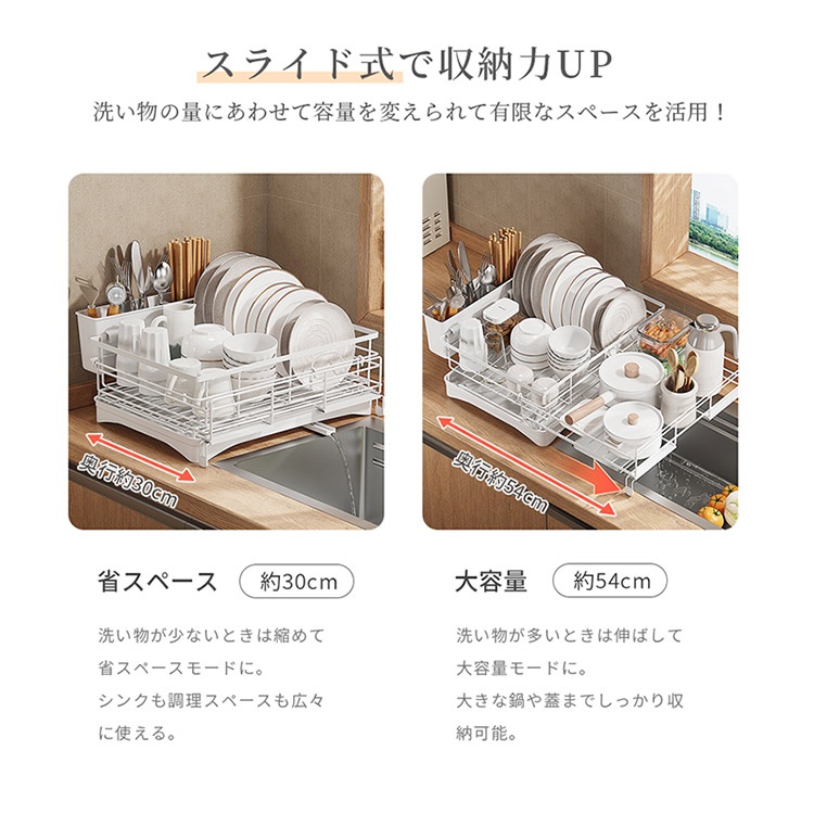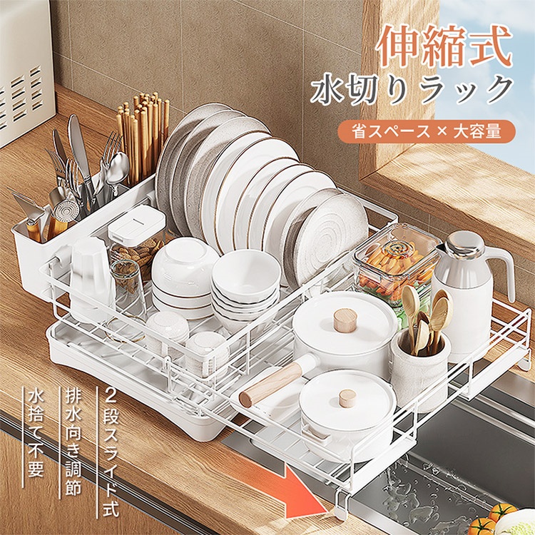 水切りラック シンク上 水切りかご シンク上 伸縮式 大容量 スリム 2段スライド式 調整可能 省スペース 食器水切り キッチンラック 台所 伸縮水切りラック