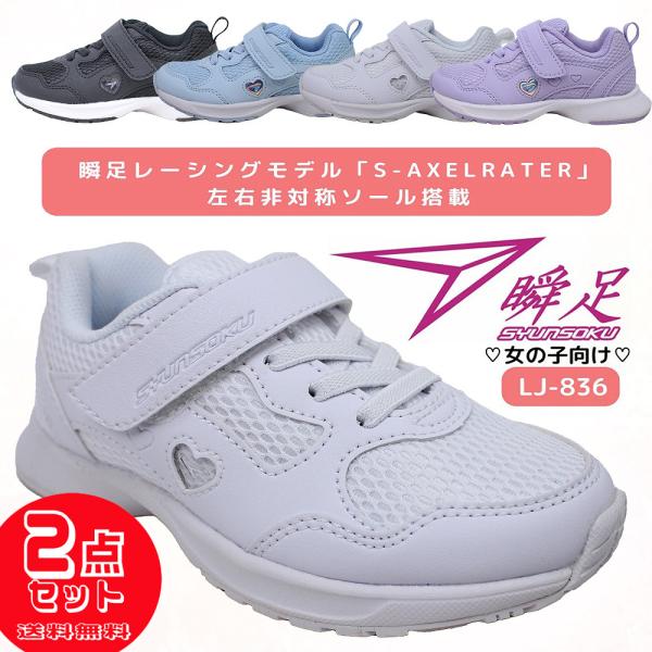 2足セット6204円 瞬足 女の子 ジュニア キッズ スニーカー 白靴 マジックテープ ホワイト ブラック サックス パープル 幅広2E 子供靴 小学