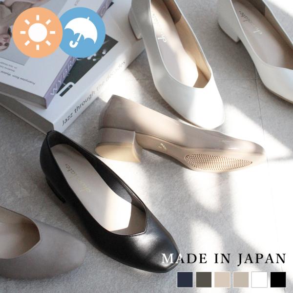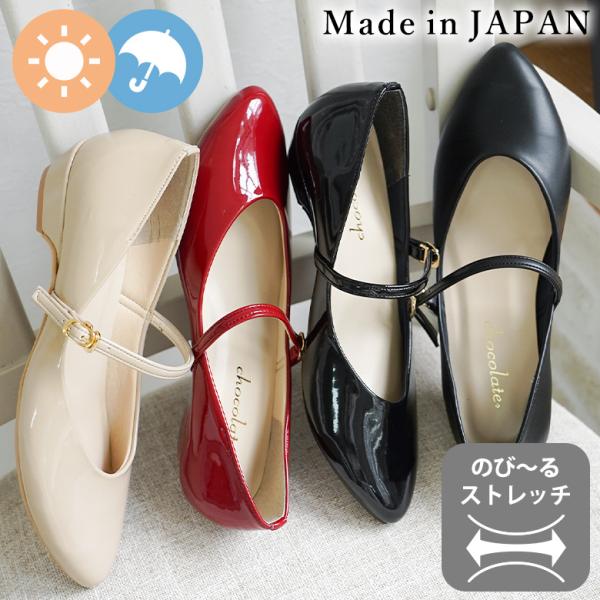 【送料無料 】 日本製 幅広 ストレッチ スクエアトゥ パンプス ストラップ 柔らか 晴雨兼用 レイン 防水 ストレッチ 歩きやすい シンプル ぺたんこ ローヒール
