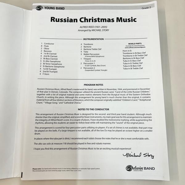 1944年に作曲されたアルフレッド・リードの人気曲「ロシアのクリスマスの音楽」をストーリー氏が初級バンド用にアレンジした楽譜です。古いロシアのキャロルが使われている名曲です。