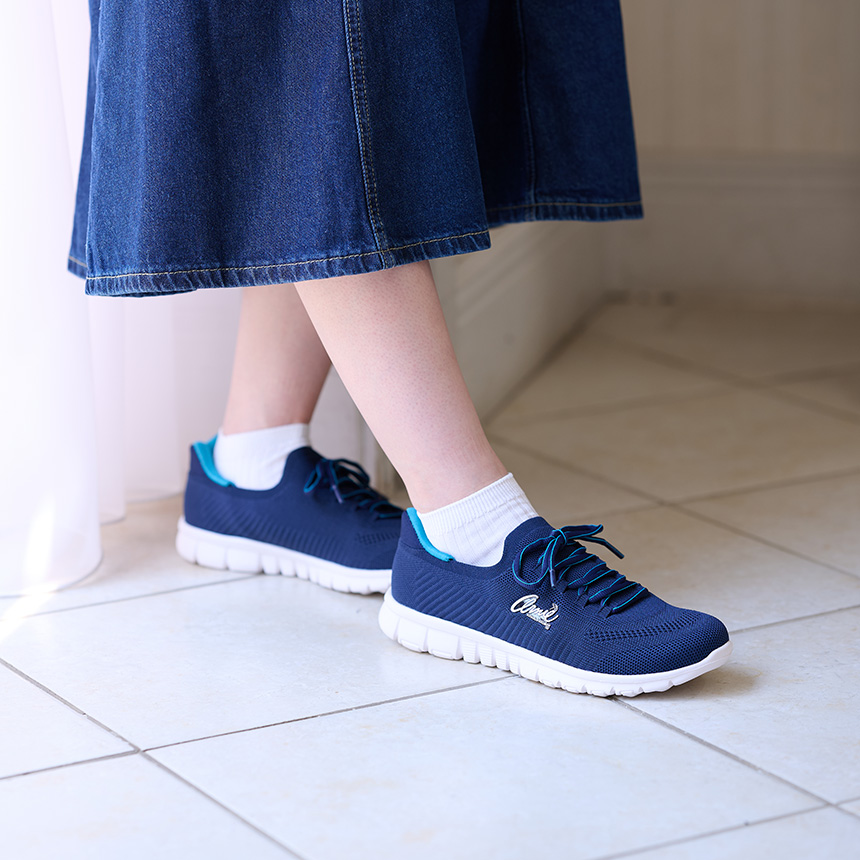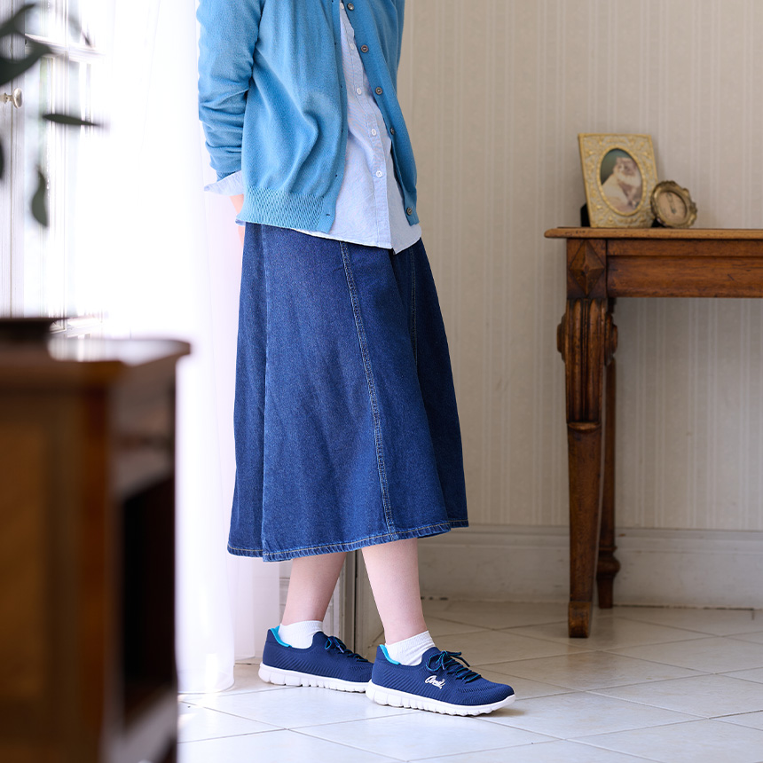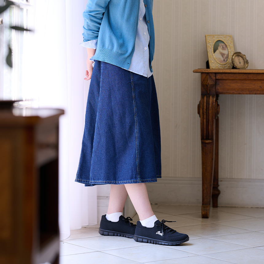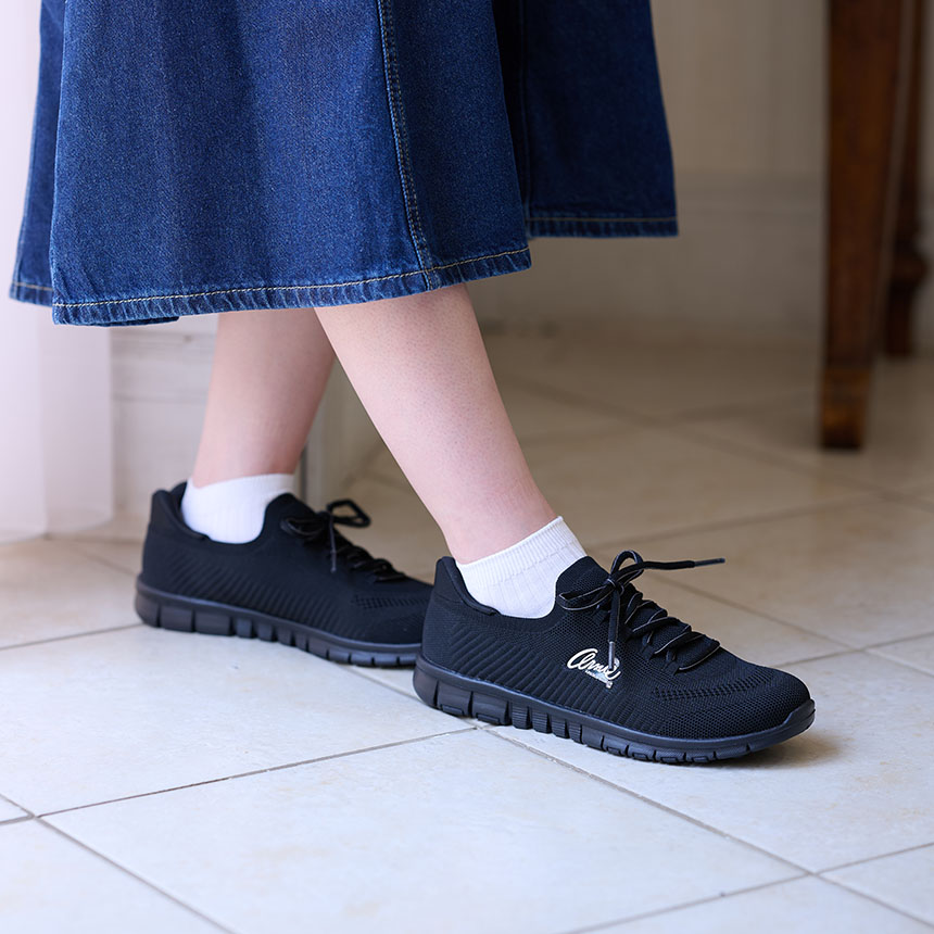 朝の急いでいる時に、両手が荷物でふさがっている時も、かがまないで簡単に着脱できるシューズです。