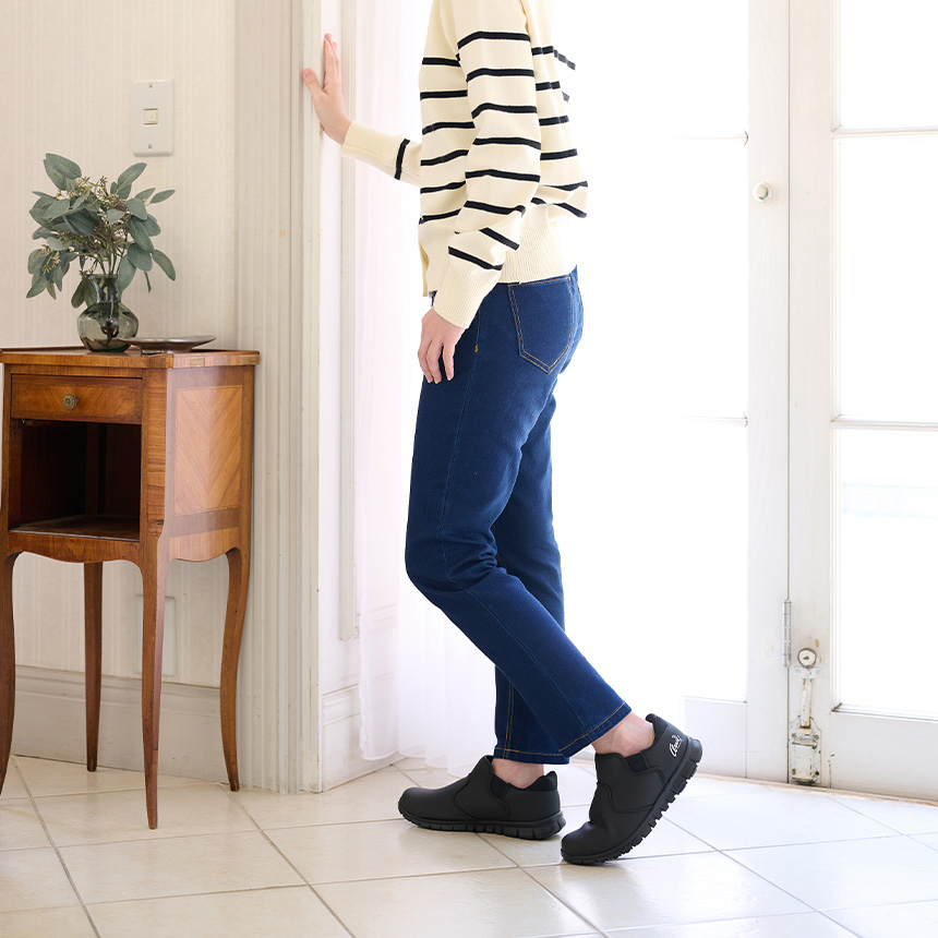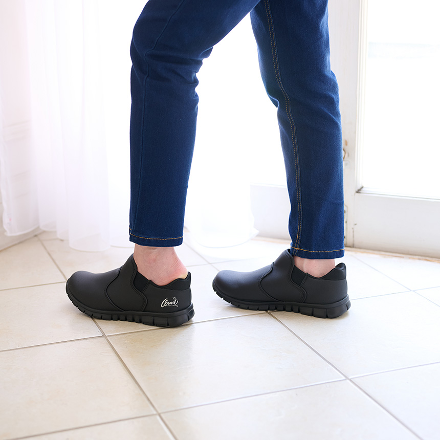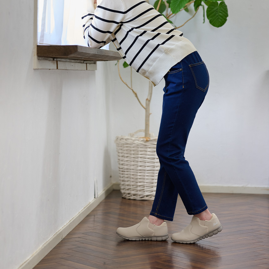 朝の急いでいる時に、両手が荷物でふさがっている時も、かがまないで簡単に着脱できるシューズです。
