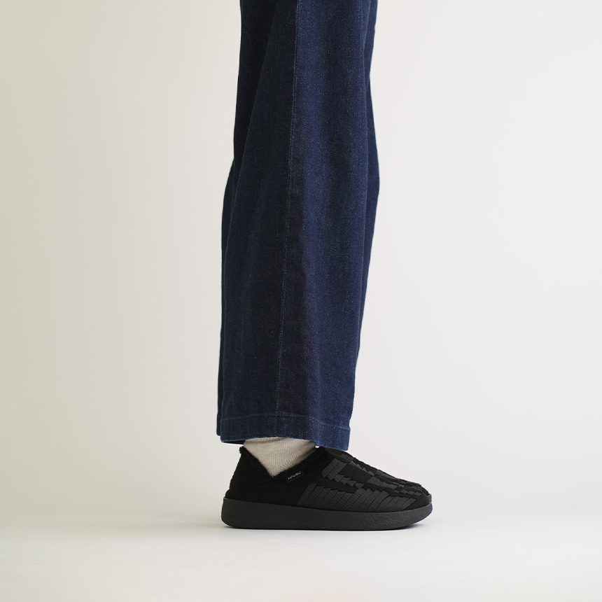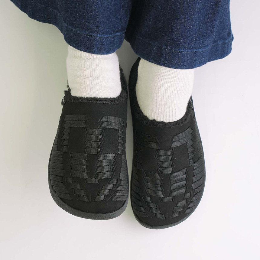 踵を踏んでスリッポンとしても着用できる2WAY 仕様にアップデートし、履き口とフッドベッドにあたたかみのあるシェルパ(ボア)を配した秋冬シーズン仕様。