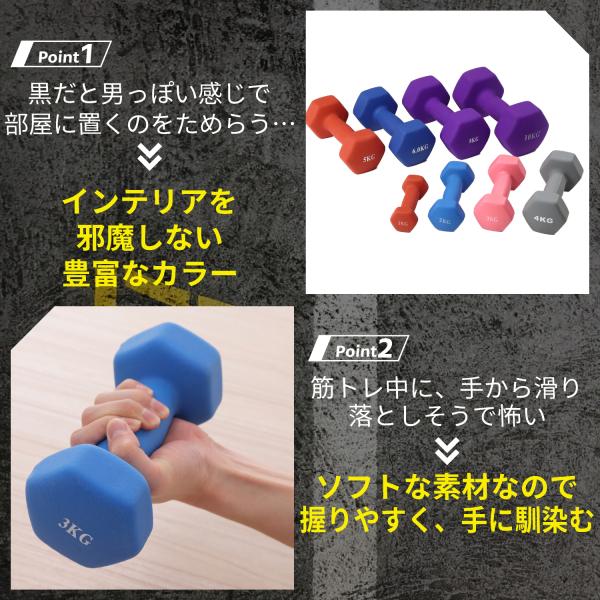 【転がりにくく設計された形状】重さは色によって異なり、1kgから10kgまである。ウェイトセレクション提案チャートを利用して、適切な重さのダンベルを選択可能