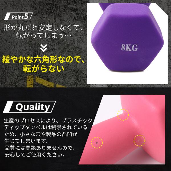 【転がりにくく設計された形状】重さは色によって異なり、1kgから10kgまである。ウェイトセレクション提案チャートを利用して、適切な重さのダンベルを選択可能