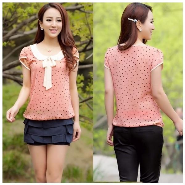 レディース トップス トップ 半袖 フレンチスリーブ ブラウス シャツ シフォン ボウタイ リボン 水玉 ドット とろみシャツ とろみブラウス