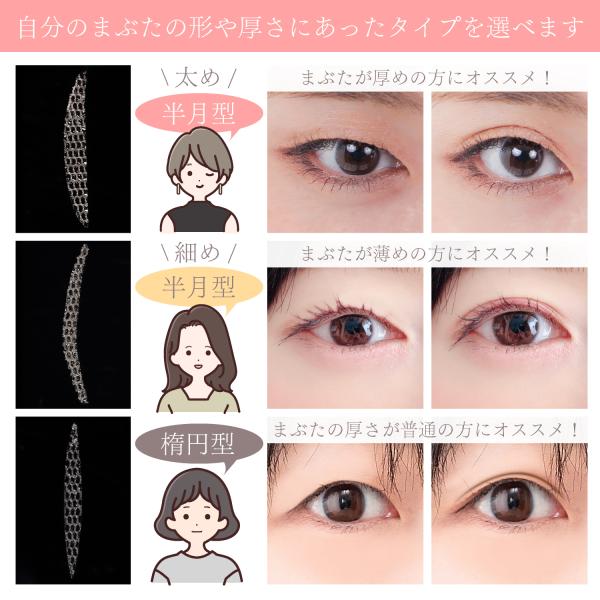 【楕円】まぶたの厚みが普通の方にオススメ【半月太め】(略称太め )まぶたが厚めの方にオススメ【半月細め】(略称細め)まぶたが薄めの方にオススメ。三つのサイズは写真を見てください。