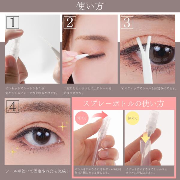 【簡単に水で貼る】簡単に水で貼り付け、のりは要りません。ピンセットでーっと剥がして、水や化粧水のスプレーでしっかりテープに濡らして、後は普通のアイテープの様に二重にしたいところに貼るだけです。【除去方法】直接に引き裂くことはできません。方法1.クレンジングオイルでアイテ一プを外します。方法2.暖かいタオルで温湿布して自然に脱落させます。