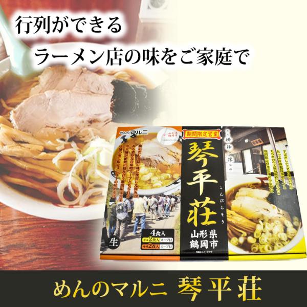 秋から春にかけて期間限定営業の琴平荘のラーメンが楽しめる4食セット。山形が誇る名店の中華そばと味噌そばをご家庭でも。