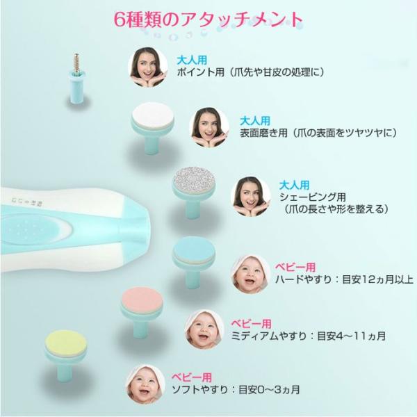 ● アタッチメントは、赤ちゃん用が、ソフトやすり(目安0〜3ヵ月)、ミディアムやすり(目安4〜11ヵ月)、ハードやすり(目安12ヵ月以上)の3種類。大人用が、表面みがき、シェービング用(爪の長さや形を整える)、ポイント用(爪先や甘皮の処理)の3種類です。