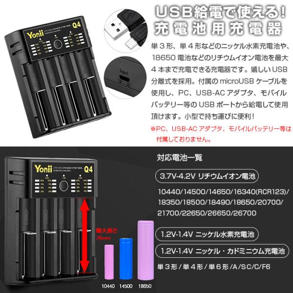 充電池用充電器 USB給電式 単3形 単4形 ニッケル水素充電池 18650電池など 最大4本まで 軽量 コンパクト