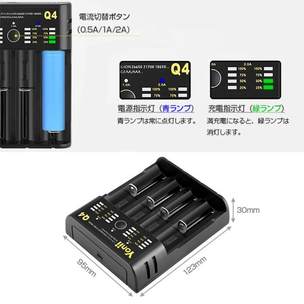 ● 単3形、単4形のニッケル水素充電池(NIMH)、ニッケル・カドミニウム充電池(NICd)や、18650電池などのリチウムイオン電池を最大4本まで充電できる充電器です。小型で持ち運び便利。
