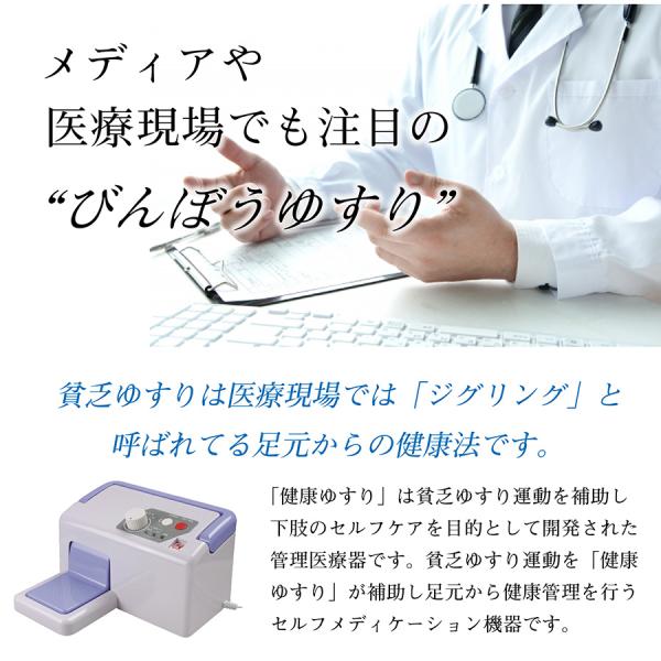 健康ゆすりは、貧乏ゆすり運動を補助し下肢のセルフケアを目的として開発された管理医療器です。貧乏ゆすりは、医療現場ではジグリングと呼ばれ、今注目の足元からの健康法です。健康ゆすりはそのような貧乏ゆすり運動を補助し足元から健康管理を行うセルフメディケーション機器です。