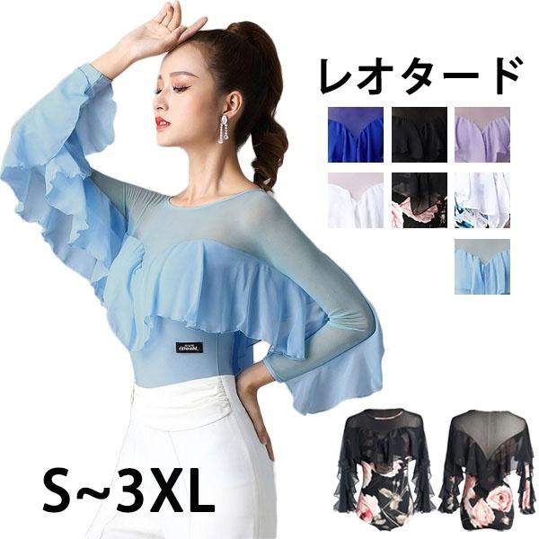 レオタード 単品 社交ダンス レッスンウェア フリル パッド付き レディース 長袖 シャツ トップス ダンスウェア 練習着 モダン スタンダード