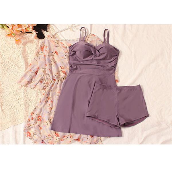 ワンピース水着 体型カバー スモック付 水着 レディース 大きいサイズ ママ水着 紫 プラスサイズ ワイヤー入り 露出控えめ 花柄 女性ぽっちゃり