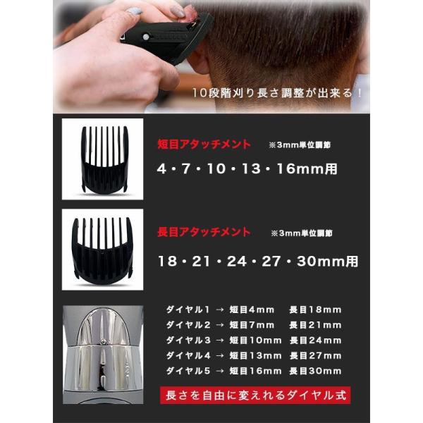 4〜30mmまで10段階に長さを調節できる2種類のアタッチメントが付属。坊主やツーブロックスタイルを作れます。