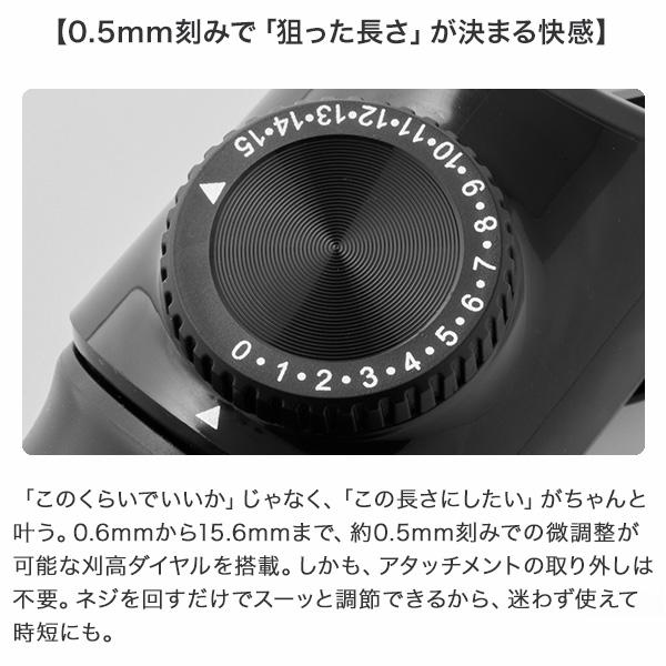 アタッチメントは1つだけ。なのに、刈高は0.6mm〜15.6mmまで、約0.5mm刻みで細かく調整可能。
