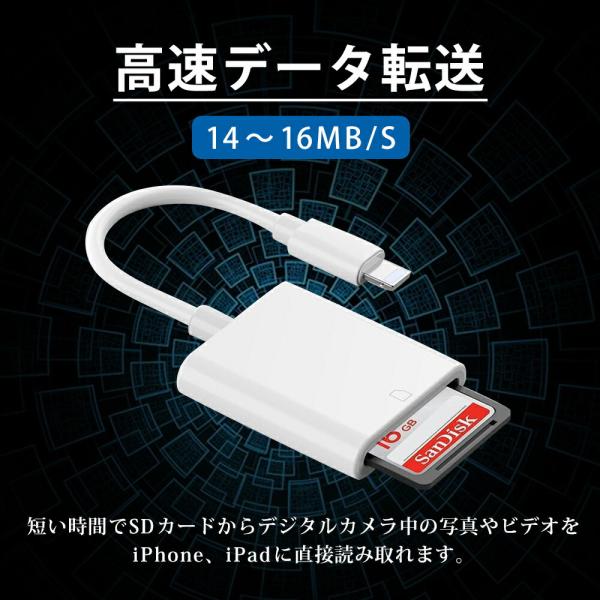 14MB/S~16MB/Sの高輸送速度、短い時間でSDカードからデジタルカメラ中の写真やビデオをiPhone、iPadに直接読み取れます。