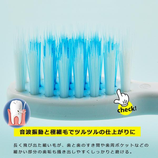 ブラシの長く飛び出た細い毛が、歯と歯のすき間や歯周ポケットなどの細かい部分の歯垢も掻き出しやすくしっかりと磨けます。