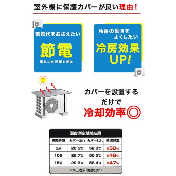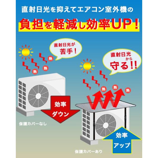 カバーを設置するだけで日光による劣化を防ぐことと、室外機にあたる直射日光が排熱の妨げとなるのでエアコンの電力効率が低下してしまう・・・