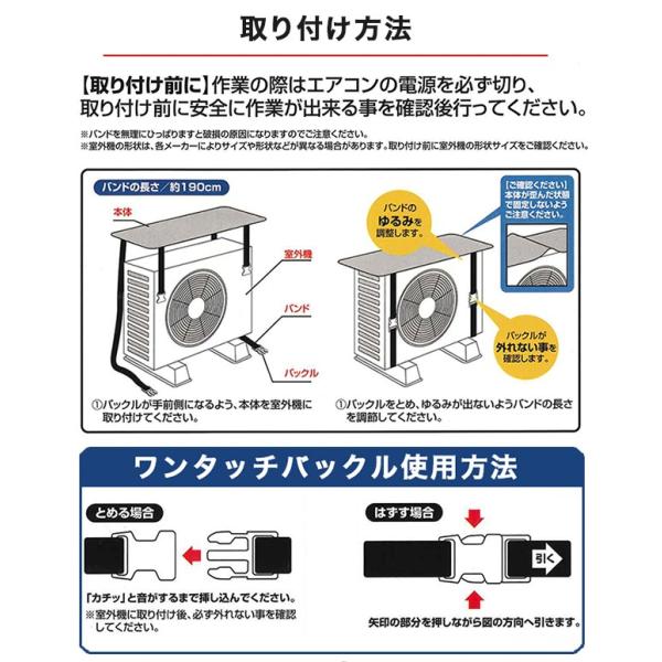 このカバーをつけることで、エアコンの室外機が直射日光に当たるのを防ぎ、室外機本体の故障や劣化、周辺の空気の温度を下げることができる。