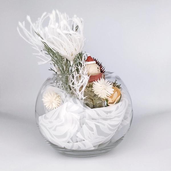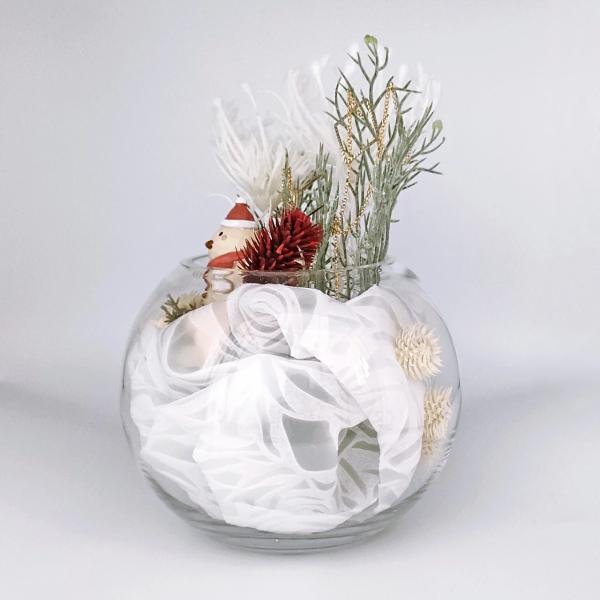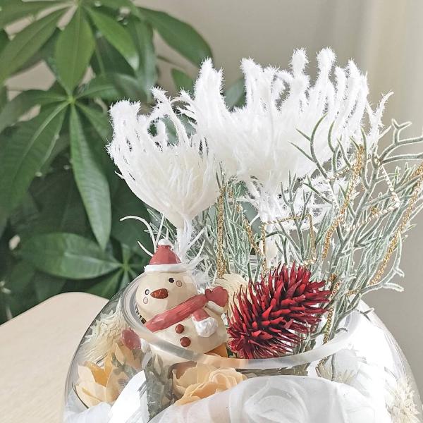 ガラス鉢の中から雪だるまがひょこっと顔を出しており冬の草花とともにふわふわの雪に包まれているようなとても愛らしいデザインです♪