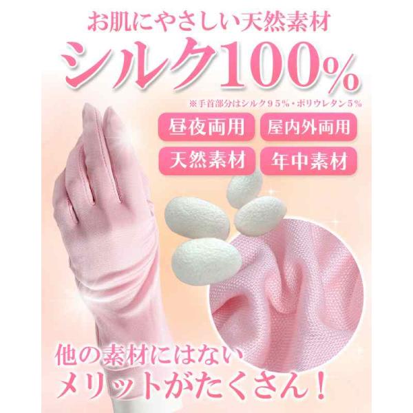 【UVカット ・紫外線対策】 薄手のニット生地で通気性に優れており、サラリとした付け心地 。シルク (絹)の 紫外線遮蔽率は綿の約2倍もあり、お肌を紫外線から守ります。シルク100% 素材で手荒れ対策にも最適。