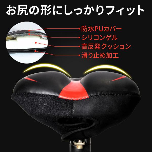 【お尻が痛くならない快適な座り心地】衝撃吸収シリコンゲルと超肉厚低反発ウレタン製のクッションの二重構造でお尻の負担をを軽減します。人間工学に基づいた立体的なデザインのサドルカバーで、中央部の溝で通気性を確保。後部は幅広に設計し体圧を分散させて快適な座り心地を実現させてます。<br><br>