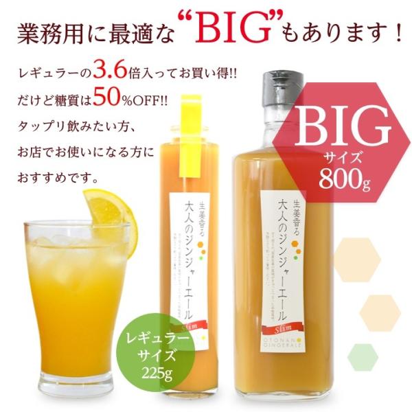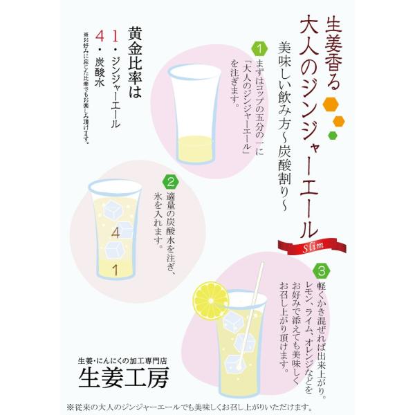 レギュラータイプのジンジャーエールに比べ、甘さを控えめにしました。(1)糖質50%OFF(2)生姜汁増量(3)国産生姜100%