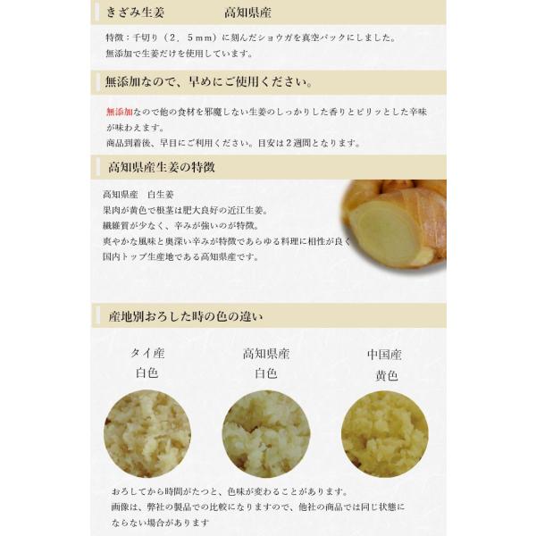 きざみ生姜の特徴:千切り(2.5mm)に刻んだ生姜を真空パックにしました。無添加なので他の食材を邪魔しない生姜のしっかりした香りとピリッとした辛味が味わえます。