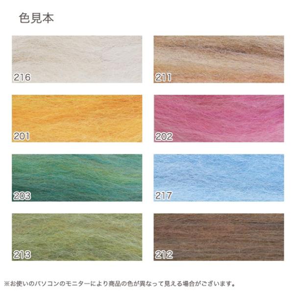 同系色のメリノウールを4〜5色混合した羊毛です。自然な混ざり具合なのでニュアンスのある表情、味わい深い作品が楽しめます。水フェルト、針フェルトのどちらにも適しており、カラーバリエーションも豊富です。