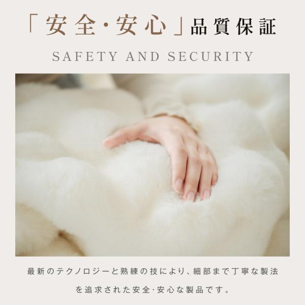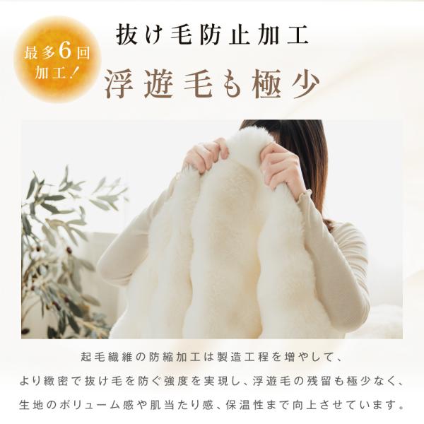 【抜け毛防止加工&安全安心】起毛繊維の防縮加工は製造工程を増やして、より緻密で抜け毛を防ぐ強度を実現し、浮遊毛の残留も極少なく、生地のボリューム感や肌当たり感、保温性まで向上させています。