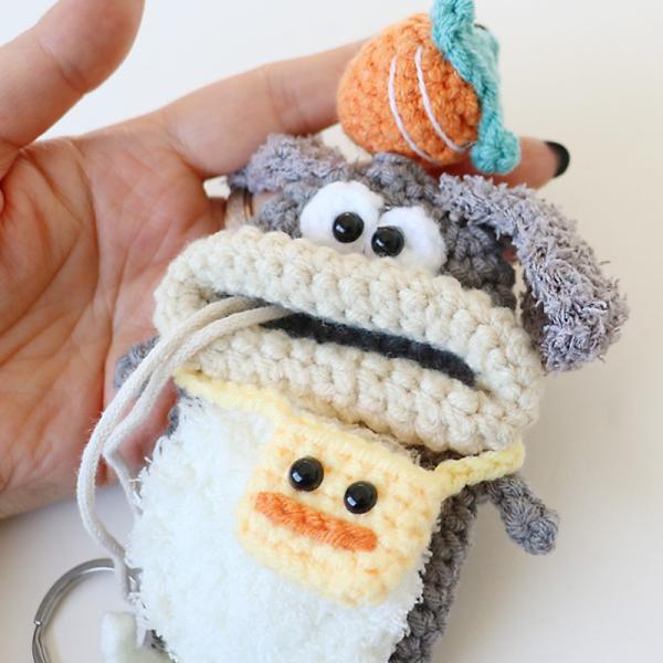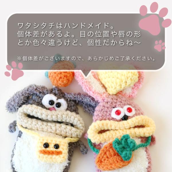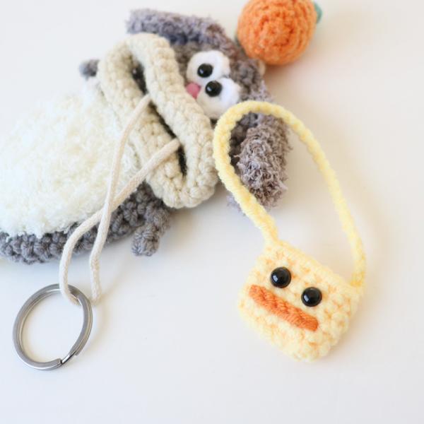 ※一部、背中側にフックがつけられるよう、毛糸の編み込み仕様が異なるものがございますが、ストラップとしてのご利用はお止めください。本体が落下し、紛失や破損の原因となります。