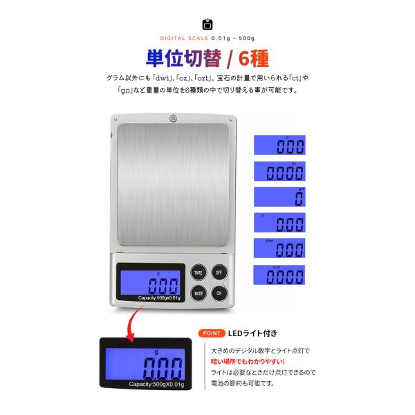 - グラム以外にも 「dwt」、「oz」、「ozt」、 宝石の計量で用いられる「ct」や「gn」など重量の単位を6種類の中で切り替える事が可能です。