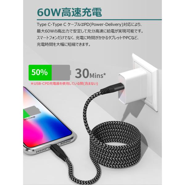 急速充電ケーブル タイプc 1m 2m 3m type-c ケーブル iphone typec USB-C 60W 3A L字 I字 PD対応 type-cケーブル 急速充電 高耐久性 ナイロン編み