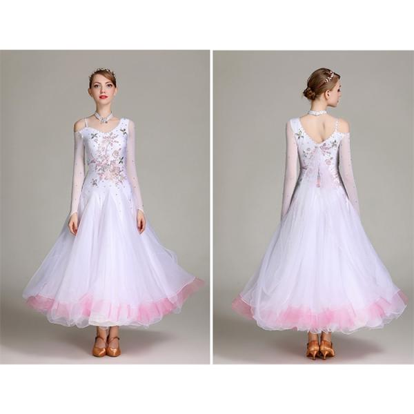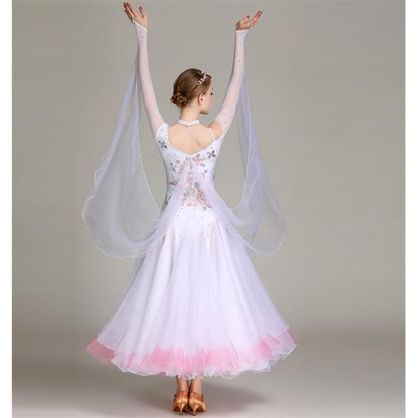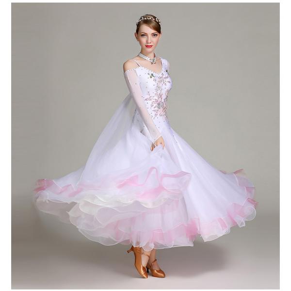 モダンダンス フレアスカート ドレス ステージ衣装 ワルツ 社交ダンス衣装 レディース 練習用 競技用 快適な動き 長袖 白