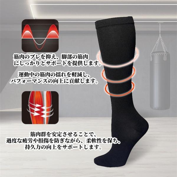 通気性と伸縮性に優れたナイロン風素材を使用した、オールシーズン対応の着圧スポーツソックスです。ふくらはぎにフィットして無駄な揺れを抑え、筋肉をサポートしながら疲労を軽減します。