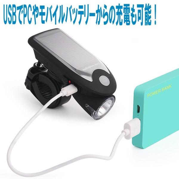自転車用ヘッドライト LED USB充電可能 ソーラーパワー コンパクト設計 240Lm 防水 SSLED3W