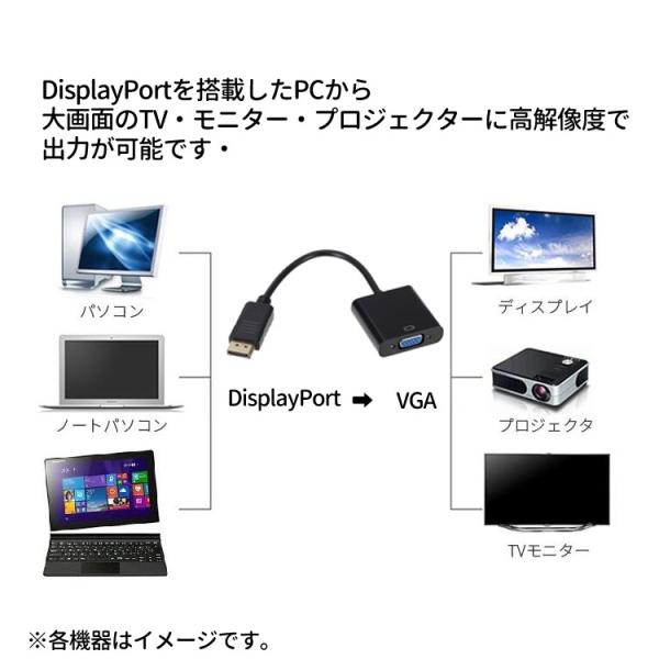 DisplayPort(オス)を備えるノートPC等に接続し、VGA端子が搭載されているモニターやテレビなどに映し出すことができます。