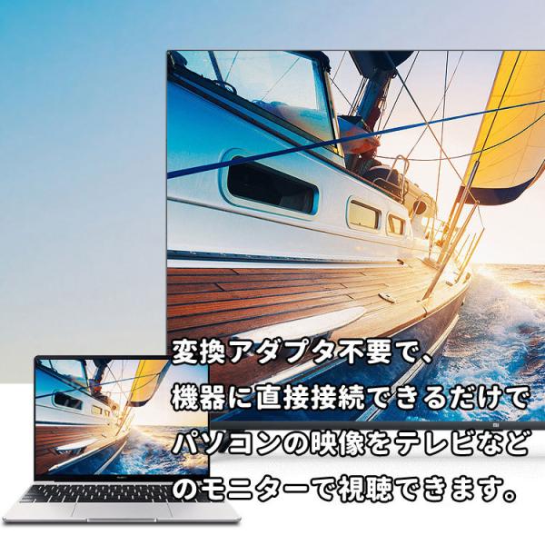 DisplayPort対応のノートパソコン、デスクトップPCからHDMI入力端子のあるテレビ、モニター、プロジェクタ に接続して、PCの画像や映像を楽しむことができます。