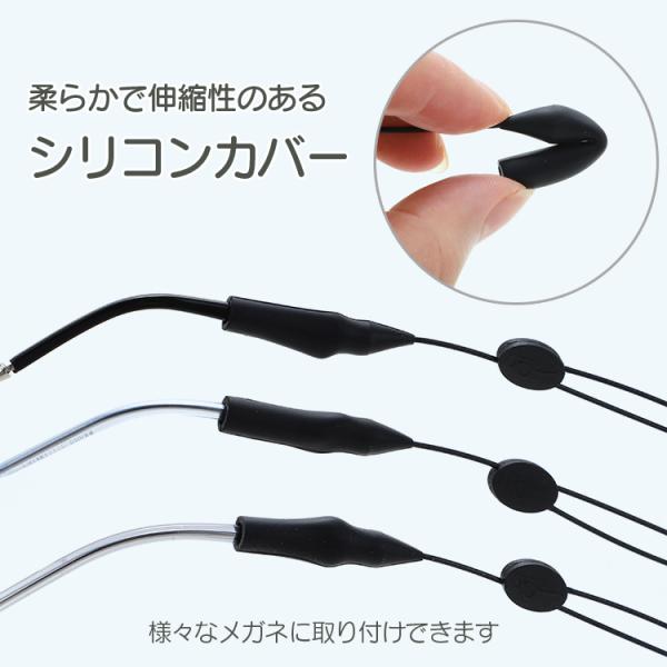 柔らかいシリコン製の耳あてを使用、伸縮性があるため様々なメガネに装着、ツルをしっかりホールドすることができます。