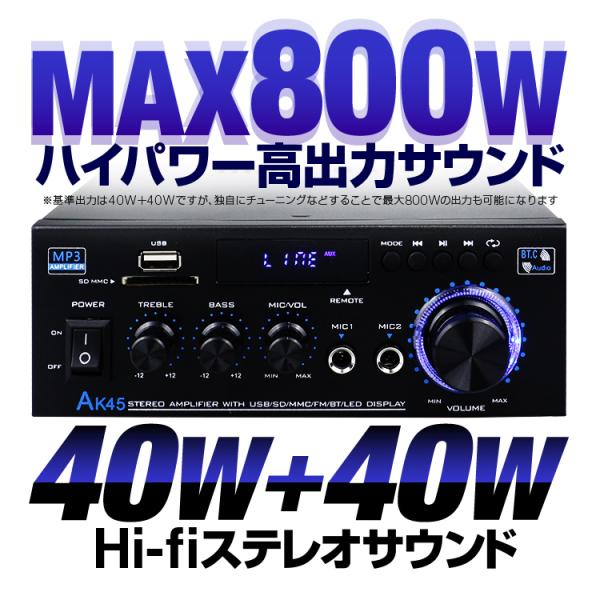 デジタルアンプ オーディオアンプ 40W+40W 最大出力800W Bluetooth5.0 USBメモリ SDカード Hifi ステレオ デュアルマイク端子付き リモコン付 LPAK45