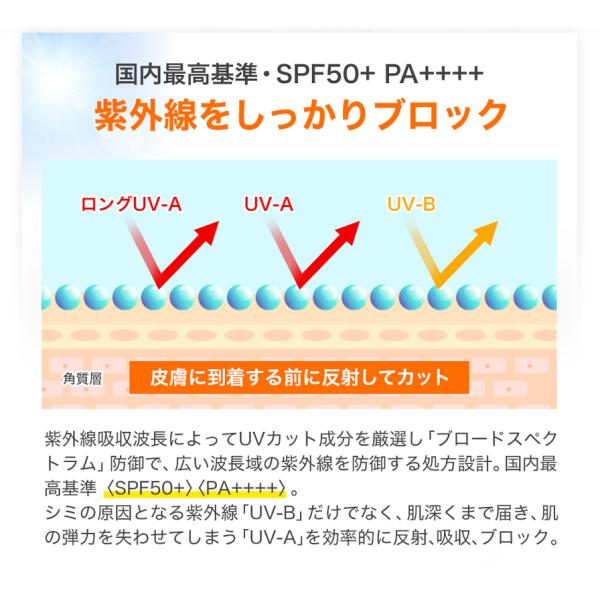 国内最高水準のSPF50+、PA++++を採用し、さらに新技術「FBMシールドコンプレックス※1」配合でブルーライト、大気汚染物質、花粉などのダメージからも肌を保護。汗・水・こすれ(摩擦)に強い、ウォータープルーフタイプ「UV耐水性★」を取得。