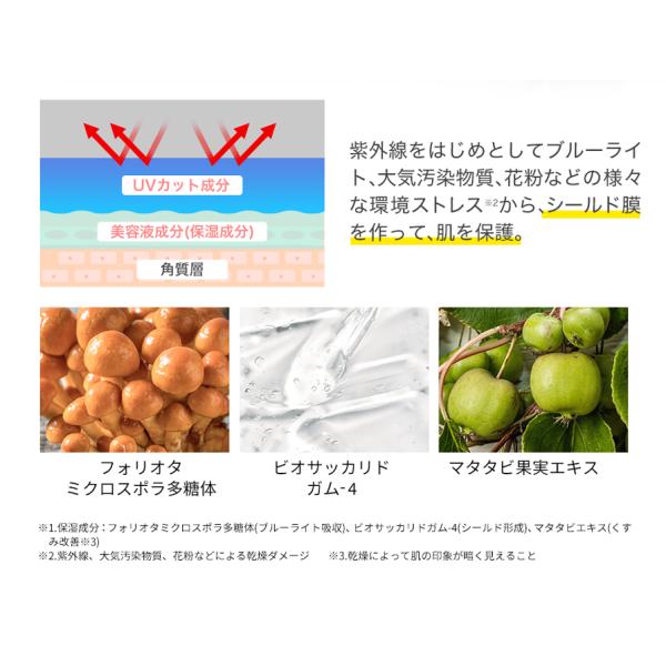 ※1.保湿成分:フォリオタミクロスポラ多糖体(ブルーライト吸収)、ビオサッカリドガム-4(シールド形成)、マタタビエキス(くすみ改善 ※乾燥によって肌の印象が暗く見えること)