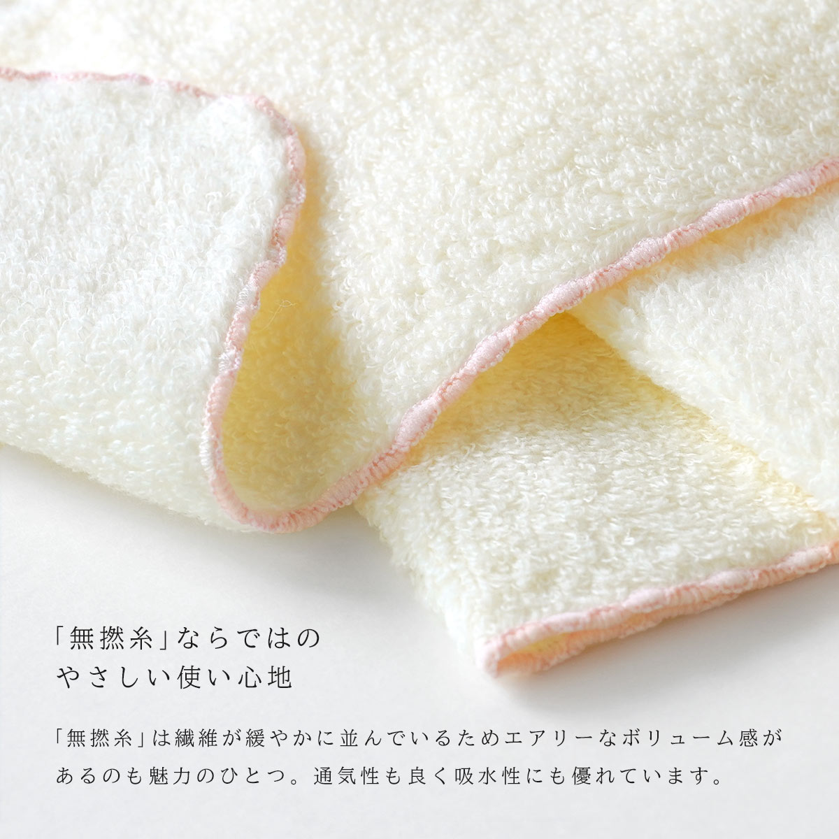 「無撚糸」は繊維が緩やかに並んでいるためエアリーなボリューム感があるのも魅力のひとつ。やさしい使い心地で通気性も良く吸水性にも優れています。
