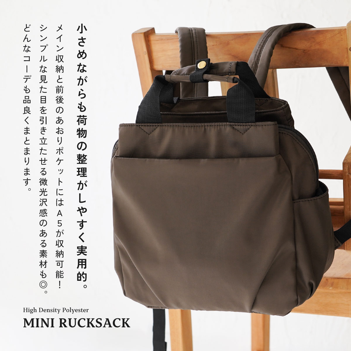 落ち着いた光沢感がある高密度ポリエステルを使用したミニリュックサック。 シンプルなデザインで正面と背面にはアクセントとなるタック入り。やさしい雰囲気を醸し出しています。
