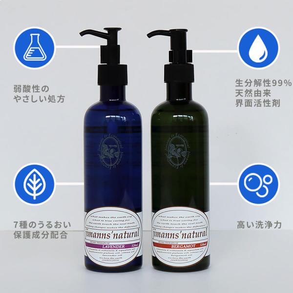 成分:界面活性剤(21%、アルキルエーテル硫酸Na、脂肪酸アルカノールアミド、アルキルアミドベタイン、ポリオキシエチレンソルビタン脂肪酸エステル)、安定化剤、トコフェロール、柑橘類果皮油、スクワラン、ヒアルロン酸Na、アスコルビン酸、ウメ果実エキス、グレープフルーツ種子エキス、キレート剤、ラベンダー精油またはベルガモット精油